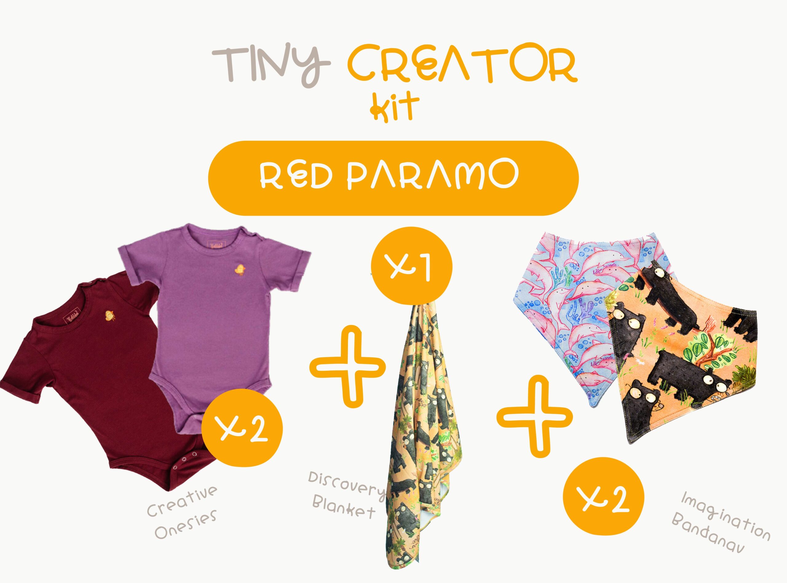 Red Páramo – Treasure Hunt Red and Rock Band Purple onesies, Paramo blanket, Páramo & Río Amazonas bandana bibs