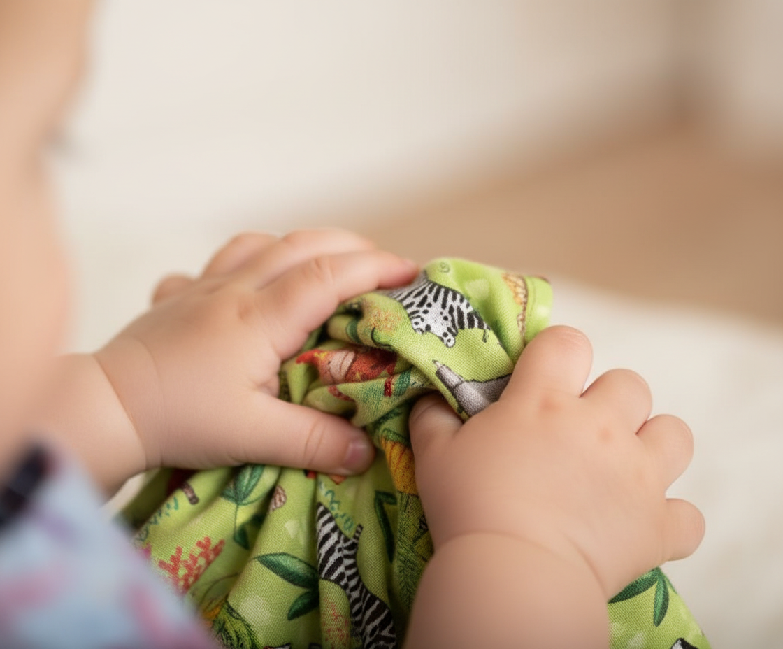 The onesies and blanket create a predictable, comforting environment where exploration can happen naturally.